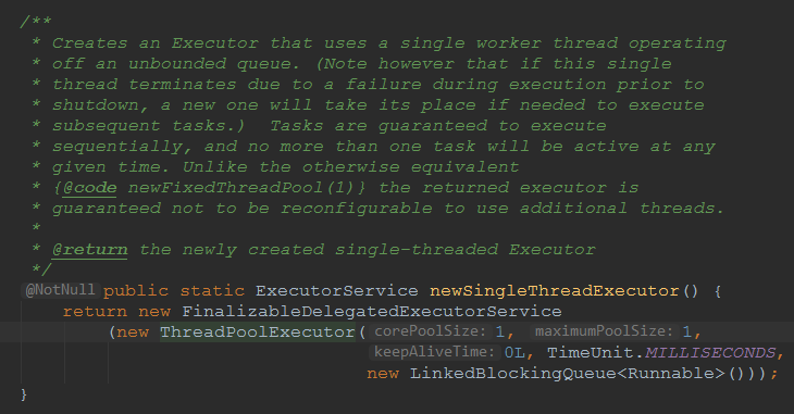 newSingleThreadExecutor(),它的特点在于工作线程数目被限制为 1,操作一个无界的工作队列,所以它保证了所有任务的都是被顺序执行,最多会有一个任务处于活动状态,并且不允许使用者改动线程池实例,因此可以避免其改变线程数目。